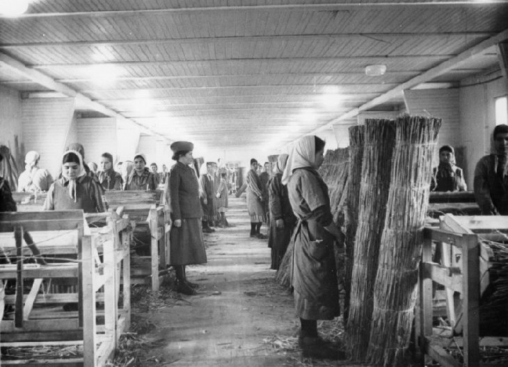 Romani (Gypsy) inmates stand at attention during an inspection of the weaving mill, site of forced labor at Ravensbrück. This image is from an SS propaganda album.