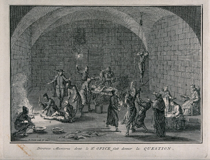A torture chamber of the Spanish Inquisition with suspected heretics having their feet burned or being suspended with a rope from a pulley while scribes note down confessions. Engraving by B. Picart, 1722. Wikimedia Commons