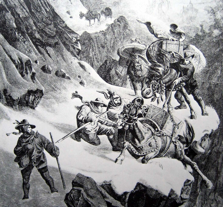 Muleteers at the Gotthard Pass, crossing the Alps. Upload by Adrian Michael, Public domain, via Wikimedia Commons