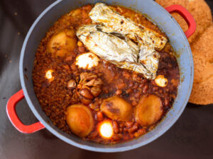 Some foods, like gefilte fish—ground pike or carp, and usually served with chrain, a spicy dip made from grated horseradish and beets—and cholent, a slow-cooked meaty stew, were devised in accordance with the various food-related Sabbath prohibitions in mind. Other foods have symbolic meanings, like kreplach, which is a type of dumpling with meat “hidden” inside that’s eaten on “hidden holidays” like the day before Yom Kippur and Purim; and kugel, a type of casserole, that may descend from pashtida, a layered concoction that’s mentioned in the Talmud.