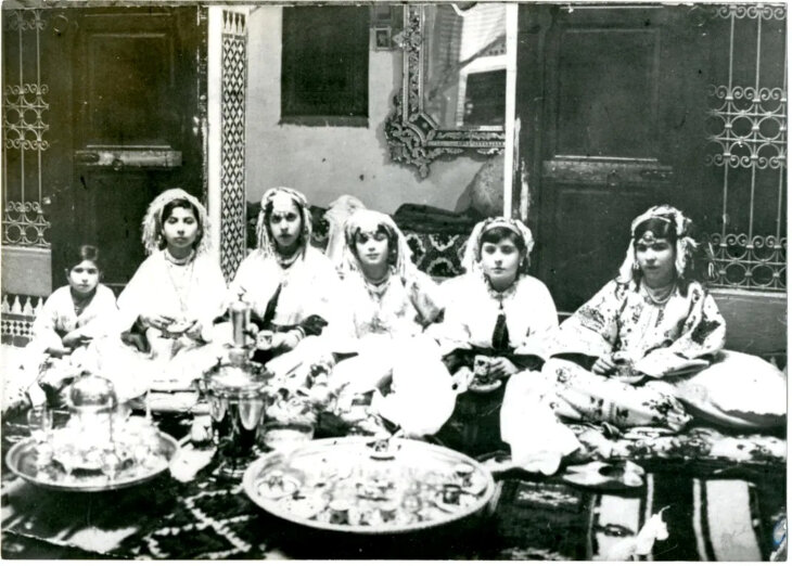 A group portrait of Moroccan Jewish women drinking tea, circa 1940 to 1950