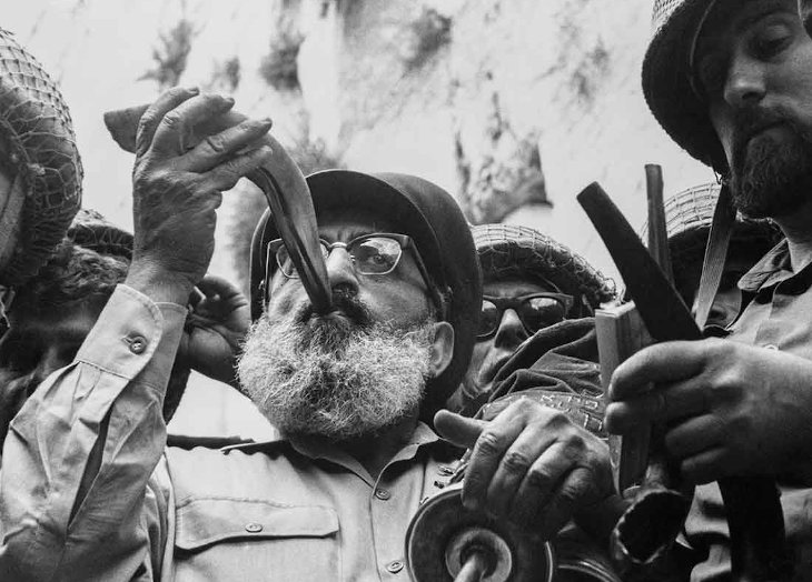 Rabbi Goren blowing the shofar at the Western Wall, 1967
