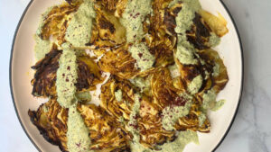 These cabbage steaks are seasoned with bold Jerusalem grill spice and roasted until crispy, making them an aromatic and flavorful side. They hold up well in the fridge and reheat beautifully.