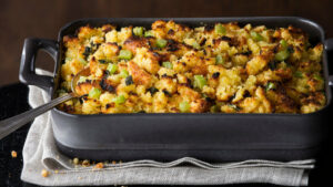 This stuffing swaps regular bread for challah, giving it a fluffy texture and slight sweetness that pairs beautifully with mushrooms and herbs. It’s perfect for Thanksgiving or Shabbat, baking well ahead of time and easily reheated.