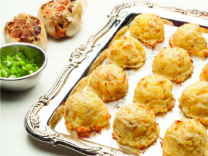 These mashed potato mounds, enriched with garlic, are individually portioned and baked for a golden crust. They’re easy to make ahead, store, and reheat, adding a unique twist to traditional mashed potatoes.