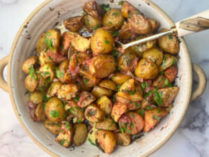 This warm potato salad combines fingerling potatoes with a mustard vinaigrette and fresh herbs for a flavorful, comforting side. The potatoes hold their texture well, making this a great make-ahead option that only improves in flavor when reheated.