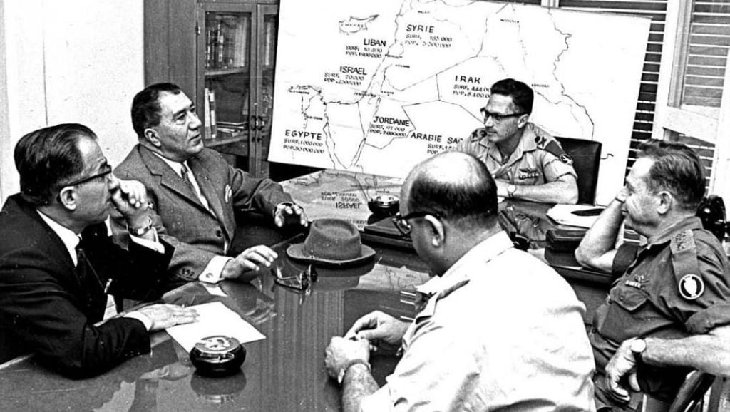 Top Iranian military officials Hasan Toofanian and Bahram Ariana (left), meet with Israeli officers in the headquarters of the Israel Defense Forces, 1975. (photo credit: public domain, Wikimedia Commons)