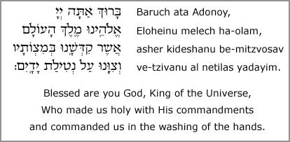 What to do? Go to the sink, take the special washing cup, pour water on each hand two or three times, make the blessing “Al Netilat Yadayim,” return to your seat, and sit quietly. When everyone has washed their hands, take the challah, make the blessing, “HaMotzi,” cut the bread, dip a piece in salt, and take a bite. After that, cut and distribute pieces to everyone else. At that point, it’s ok to talk.