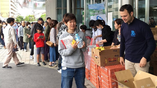 Israeli aid volunteers distribute supplies to Japanese survivors. Photo via IsraAID