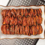 Arrange sweet potato slices in prepared baking dish by standing them upright in tight rows. You should have parallel lines of sweet potato slices (skin showing) along the length of the dish. Drizzle with any remaining oil mixture.