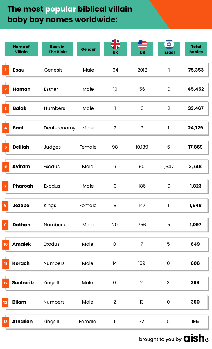 Aish.com compiled a list of 30 of the most popular biblical villains found in the Hebrew Bible. Our team then analyzed data from the over 4 billion people across 236 jurisdictions using the forebears.io database (more detail on the source data can be found here), which revealed the most popular biblical villain-inspired names for boys and girls in the United States, Israel, and across the world.