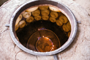 Plov is a favorite Bukharian dish. There are many unique recipes depending on the community, but the basics include slow roasting meat, rice, carrots, chickpeas and black currants over an open fire with a generous helping of oil and spices. Sometimes plov is made with dried fruits as well.