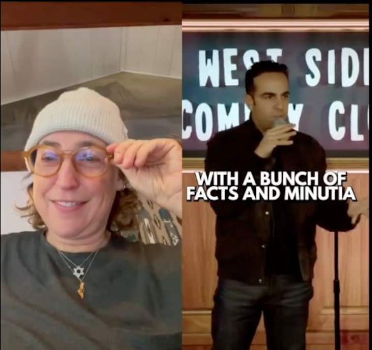 But things got serious this past January when one of his bits about Israel went viral. Mayim Bialik posted a side-by-side video of herself enjoying his bit on catchy protest chants. In it, she is laughing so hard that she cries at Dan’s joke, where he talks about how the pro-Palestinian chants are much catchier than a pro-Israel chant, which would undoubtedly be filled with every fact about the conflict and not rhyme at all.