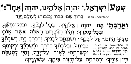 While reciting the first paragraph (Deut. 6:5-9), concentrate on accepting the commandment to love God. Touch the arm-tefillin at “Bind them…” and the head-tefillin at “and let them be tefillin…”, then kiss your fingertips.